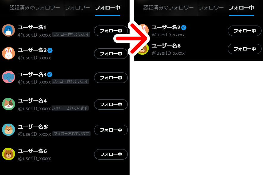 なのでフォローリストの中からフォローしてくれている人を非表示、外れている人だけを表示する方法をまとめました。